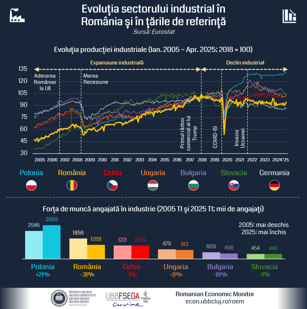 În ultimii 30 de ani, economia României a trecut prin schimbări macro-structurale semnificative: importanța sectorului de servicii a crescut, pe când ponderea sectorului industrial în economie s-a micșorat. Astfel, numărul angajaților în industria din România a scăzut cu aproximativ 1,1 milioane de persoane între anii 1995 și 2025, de la 2,4 milioane la 1,3 milioane. Comparativ cu alte țări din regiune, trendul din România devine și mai îngrijorător: în Ungaria și Cehia, numărul angajaților din sectorul industrial a rămas aproape constant în perioada respectivă, iar în Polonia acesta a crescut cu 200 de mii.